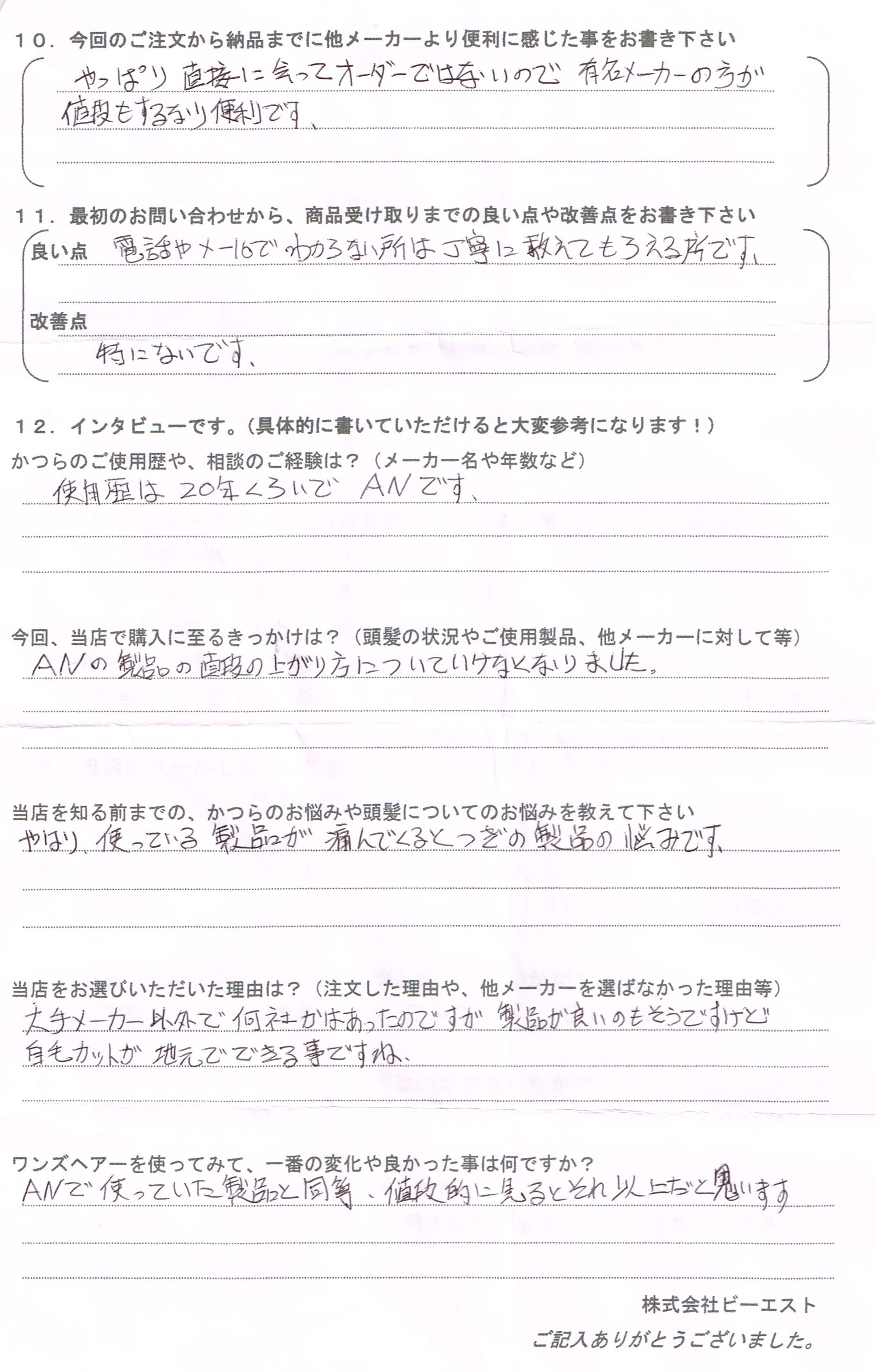 今回、通販でかつら購入は初めてでしたが、分からない所は丁寧に教えてもらえるので、不安なくオーダーが出来ました。ただ、やっぱり直接に会ってオーダーではないので、有名メーカーの方が値段はしますが便利に感じる所も有りますね。